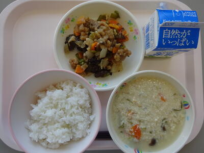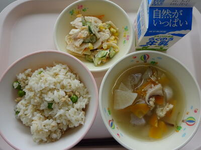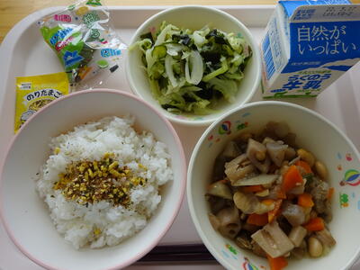 今日の給食は、「ピースそぼろごはん、牛乳、けんちん汁、れんこんサラダ」でした。