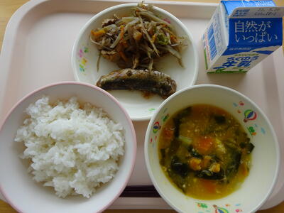 連休明けの給食は、一汁二菜の和食給食「ごはん、牛乳、かぼちゃのみそ汁、いわしの梅煮、きんぴらごぼう」でした。和食給食で、子どもたちの生活リズムを整えるお手伝いができるように取り入れました。