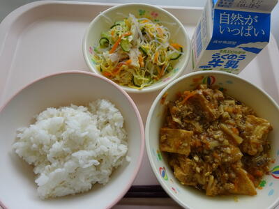 今日の給食は、「麦ごはん、牛乳、カレーマーボー豆腐、バンサンスー」です。5月の献立表を配布した時から、「カレーマーボー豆腐が、どんな料理がすごく気になります!」と、私に尋ねてきた児童がいました。