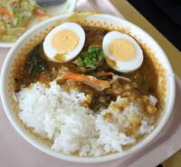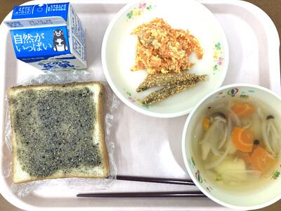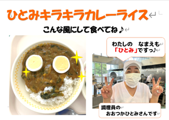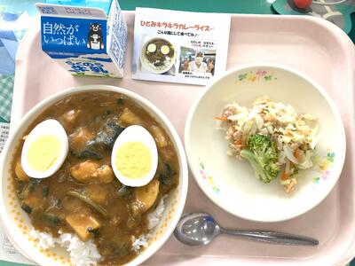 今月の献立テーマは「目にいい物を食べて、目を元気にしよう」です。今日は、目を元気にしてキラキラなひとみになるように、とりにく、チーズ、かぼちゃ、ほうれんそう、トマト、レーズンを加えたカレーです。かぼちゃは、白水小の畑でとれたものを使いました。カレーを盛り付けたら仕上げにトッピングのゆで卵をのせてください。ここでポイントなのが、「たまごをどのように置くか」です。卵を目に見立てて、顔を作ってみてくださいね。卵も目をキラキラ元気にしてくれる食べものです。目を元気にしてくれる食べものを覚えながら楽しく食べてくださいね。