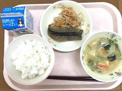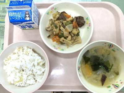 今日のおみそ汁に使っているみそは、中松の影沢さんが作られたみそです。みそは大豆から作られますが、影沢さんはその大豆から育てられていて、農薬や化学肥料を使わずに作る有機農業で育てていらっしゃいます。7月に畑を見に行ったとき、広ーい畑にたくさん大豆の芽が出ていました。しかし草も生えるので「これから暑い中での草取りが大変です」とおっしゃっていました。その大豆を収穫し、蒸して米麹や塩を加え、涼しい倉庫で寝かせて、ようやくみそが完成します。今回も香りの良いとてもおいしいみそが届きましたよ。また、みそ汁に入っているじゃがいもは、長陽の椛嶌さんが育てられた有機じゃがいもです。今日は有機食材が二つも入っている、みそ汁です。南阿蘇はすてきな食材があるすてきな地域だなぁと思います。