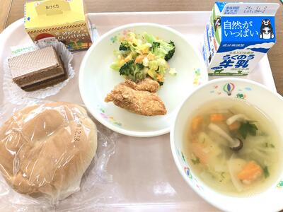 サラダはブロッコリーと星形チーズで、クリスマスツリーをイメージです。ケーキは、いちごかチョコかのセレクトでした。4年生は、ケーキよりもフライドチキンのおかわりジャンケンに殺到したようです楽しんで食べてもらえたかな?