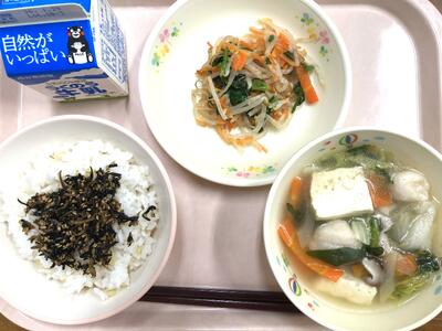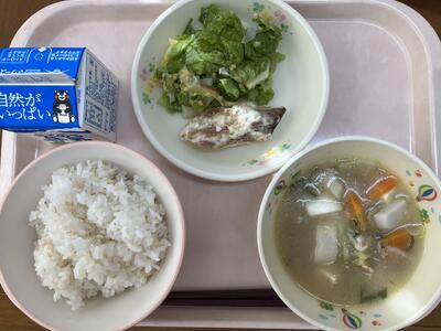 5年生の家庭科で五大栄養素を学習しますね。その中のひとつ、たんぱくしつは、主に体を作るもととなります。筋肉はもちろん、骨、ひふ、つめ、髪の毛など私たちの体を作ります。今日使われている魚や豚肉、豆腐、ハムはタンパク質が多い食品です。お肉だけでなく、魚や豆腐からもたんぱく質をとりましょうね。また、サラダ入っているサニーレタスは、白水の田尻さんから、たくさんとれたからと、ご厚意でいただきました。水水しくておいしいですよ。ありがとうございます!!