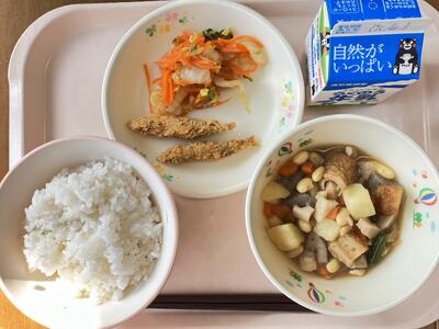 今日使っているの大豆は、みらい公社さんで、この秋に収穫された南阿蘇産の大豆です。大豆は昨日の夕方から水に一晩付けておき、朝から炊いて煮物に使いました。大豆は、「畑の肉」とも言われるほど、たんぱく質が多く含まれています。また、3年生の国語で学習するように、加工していろいろな食品に姿をかえることができる、優れものです。今日は大豆そのものの味を味わってみてくださいね。