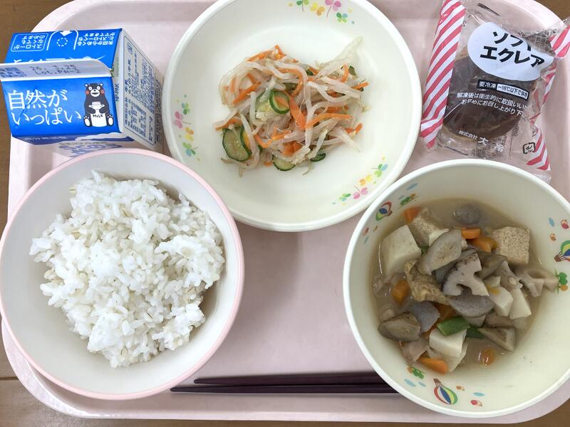 よくかんで食べていますか?しっかりかむことを意識して食べてもらうために、スープに茎わかめを入れています。給食にもよく登場するわかめは、葉っぱの部分ですが、茎わかめは、海底から生えている茎の部分です。海の中でゆらゆらとゆれても、しっかり葉っぱを支えるために、かたくなっているのですね。コリコリした食感を感じながら食べてくださいね。ちなみに、サラダのきくらげも、かみごたえがあるのでかんで食べてくださいね。新鮮な生のきくらげです