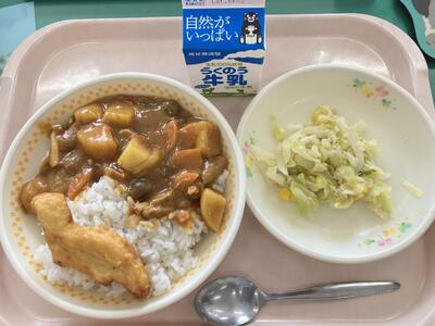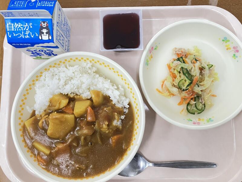 みなさん、給食は好きですか?給食の時間は楽しいですか?苦手な物があるときはちょっとテンションが下がるかもしれませんが、それでもみんなで食べる給食の時間は楽しくて、苦手な物もついペロッと食べてしましますよね。それが「学校給食」という魔法です♪楽しく食べていると、どんな味かな?どうやって作っているのかな?と興味もわいてきませんか?そして食べることそのものが、楽しくなってくるはずです。今日は、恐竜の形をしたチキンナゲットとカレーライスを、楽しんで食べてくださいね