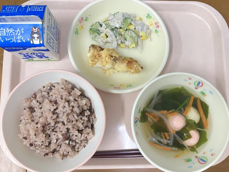 リーダーとして活躍し、引っ張ってきてくれた6年生もいよいよ卒業ですね。6年間、給食を食べてくれてありがとうございました。みんなでお祝いするために、日本の伝統的なお祝いメニューを作りました。赤飯の赤い色や豆には、災いを追い払う力があるとされていて、赤飯は、災いを遠のけ幸運を呼び込むという意味が込められています。また、れんこんは、先の見通しが良くなるという縁起物の食材です。さらに、日本では紅白をお祝いの色として扱うので、紅白のはんぺんを入れ、喜ぶという意味の昆布とかつお節で出汁をとってすまし汁にしました。6年生の今後の活躍を願って、みんなでお祝いしながら食べましょうね。