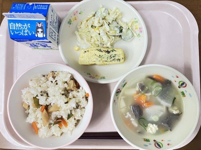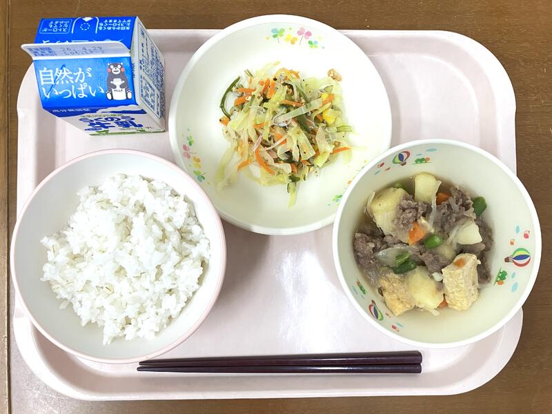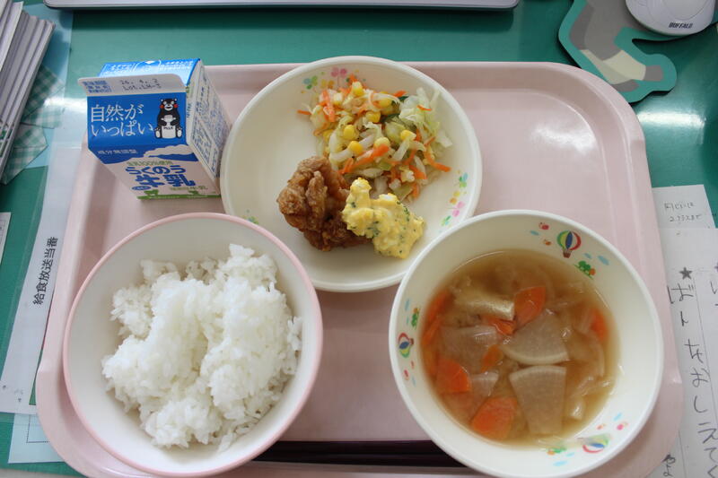 今年度最後の給食です。1年間の給食はおいしかったですか?楽しかったですか?みなさんからの「おいしかった」「苦手だったけど食べられた!」などの声がうれしかったです。また、今年は南阿蘇村でとれる食べものをた~くさん使いました。どんなものがとれるか、おぼえてくれましたか?南阿蘇にはおいしいものがた~くさんあります。最後も宮田さんちのおあしす米で締めくくります!食べることは、生きること。食べものの命をいただいて、自分の命につなげているのです。食べものや生産者、調理員さんなど、給食の向こう側を想像できる人になってほしいです。1年間食べてくれてありがとうございました。