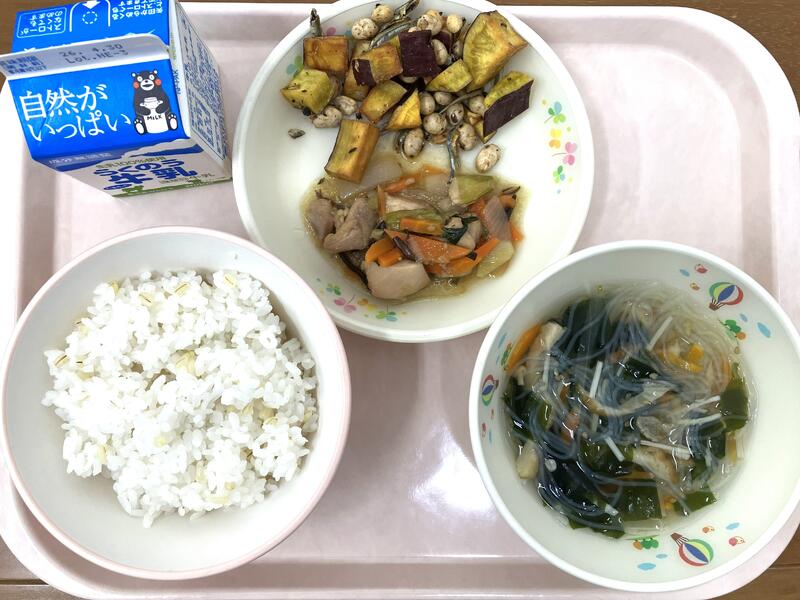 今月は人吉球磨地域の味です。熊本県の南部に位置し、地域の中心にはシンボルでもある球磨川が流れています。人吉は、城下町として栄えたところで、酒蔵、醤油蔵もあり豊かな食文化が受け継がれています。球磨地域では鮎などの川魚や、山林では栗やしいたけ、きくらげの生産が盛んです。熊本は栗の生産量が全国2位ですが、その多くは球磨地域で生産されています。つぼん汁は、人吉に伝わる郷土料理で、つぼのような深いお椀に入れ、お祝いの席などで食べられる料理です。壺のような深いお椀に入れていたことから、壺の汁、つぼん汁と呼ぶようになりました。きくらげの生産もさかんで、きくらげの佃煮は人吉名物として人気です。今日は、南阿蘇産のきくらげを使っています。