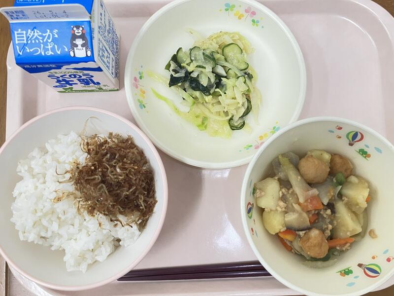 今年度最後の給食です。1年間の給食はおいしかったですか?楽しかったですか?みなさんからの「おいしかった」「苦手だったけど食べられた!」などの声がうれしかったです。また、今年は南阿蘇村でとれる食べものをた~くさん使いました。どんなものがとれるか、おぼえてくれましたか?南阿蘇にはおいしいものがた~くさんあります。最後も宮田さんちのおあしす米で締めくくります!食べることは、生きること。食べものの命をいただいて、自分の命につなげているのです。食べものや生産者、調理員さんなど、給食の向こう側を想像できる人になってほしいです。1年間食べてくれてありがとうございました。