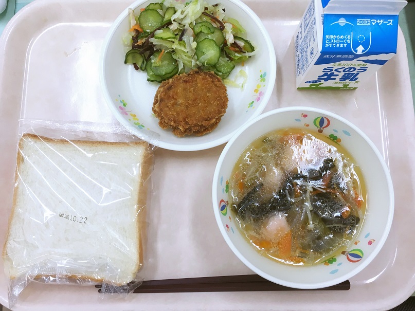 今日、1年生教室に行った時、黒板に『秋のものをみつけよう』と書いてありました。コオロギ、イチョウなど、秋ならではの名前が挙げられていました。さつま汁に、秋が旬のさつまいもとしめじが入っていたので、「今日の給食にも秋のものが入っているよ。わかるかな?」と、聞いてみると、「さつまいも!」「しめじ!」と、すぐに答えてくれました。子どもたちの食に関する興味の高さに驚いた給食時間でした♪