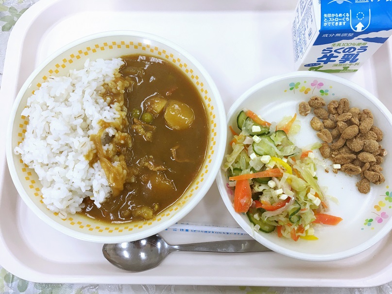 カレーじゃこふりかけがおいしかったです。サラダも美味しかったです。大豆もいっぱい食べました。(1年生)