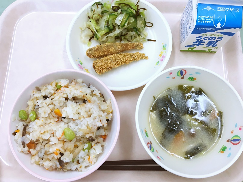 今日は、和食メニューでした。めざしに苦戦している子が多数いました。「にがい!」「酸っぱい!」と、言う意見が多かったです。しかし、ほとんどの児童が最後まで食べることができました。食わず嫌いではなく、苦手な食材も少しずつ食べられるようになればな~と思います。