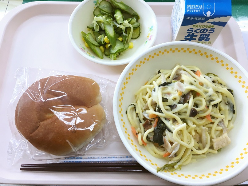 今日は、寒い日にピッタリのクリームスパゲッティを作りました。給食センターでは、手作りのホワイトソースに、別茹でしたしたスパゲッティを合わせます。子どもたちの給食時間まで間があるため、麺が伸びてしまいましたが、残さず食べていました。