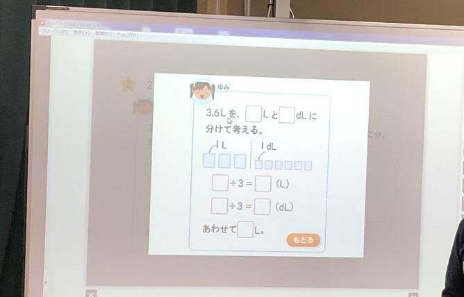 カーテンを閉めて電子黒板を使って授業をしている教室に入ってみると、天井の蛍光灯の明かりは点けたままでもしっかり画像が見えています。