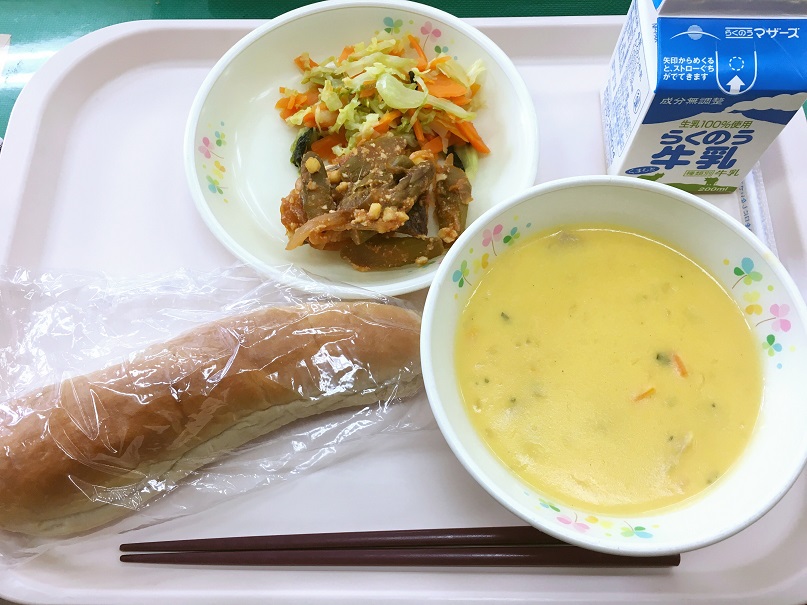今日は、にんじんが主役のキャロットスープを作りました。にんじんは、彩り・栄養・価格面から、給食に取り入れるよう心がけています。にんじんが苦手な子も食べやすいように、ホワイトルウとにんじんペーストを合わせ、シチュー風に仕上げました。また、脂質の摂取量を抑えるため、豆乳を入れました(^^)/