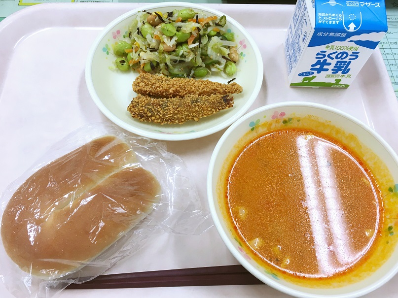 今日もとってもおいしかったです。特にカレー味の野菜がおいしかったです。明日の給食も楽しみです。(1年生)