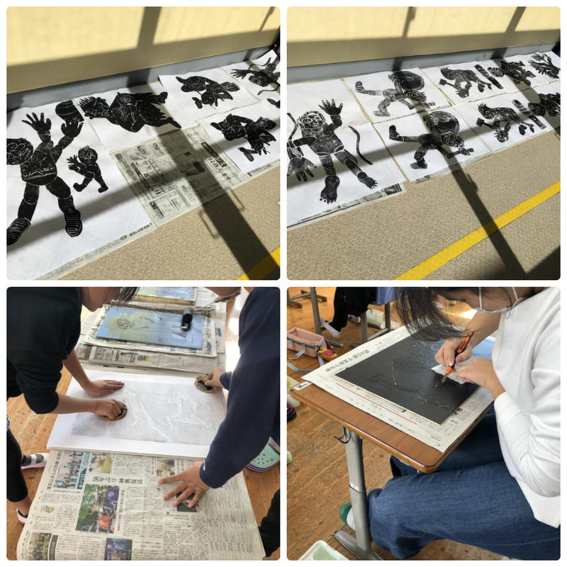 今日は、2年生と6年生が版画の印刷を行っていました。