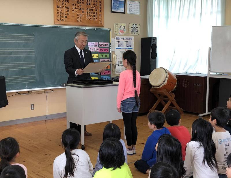 それで、直々に賞状を渡したいということで、わざわざ村長さんが学校に来られて表彰式を行いました。