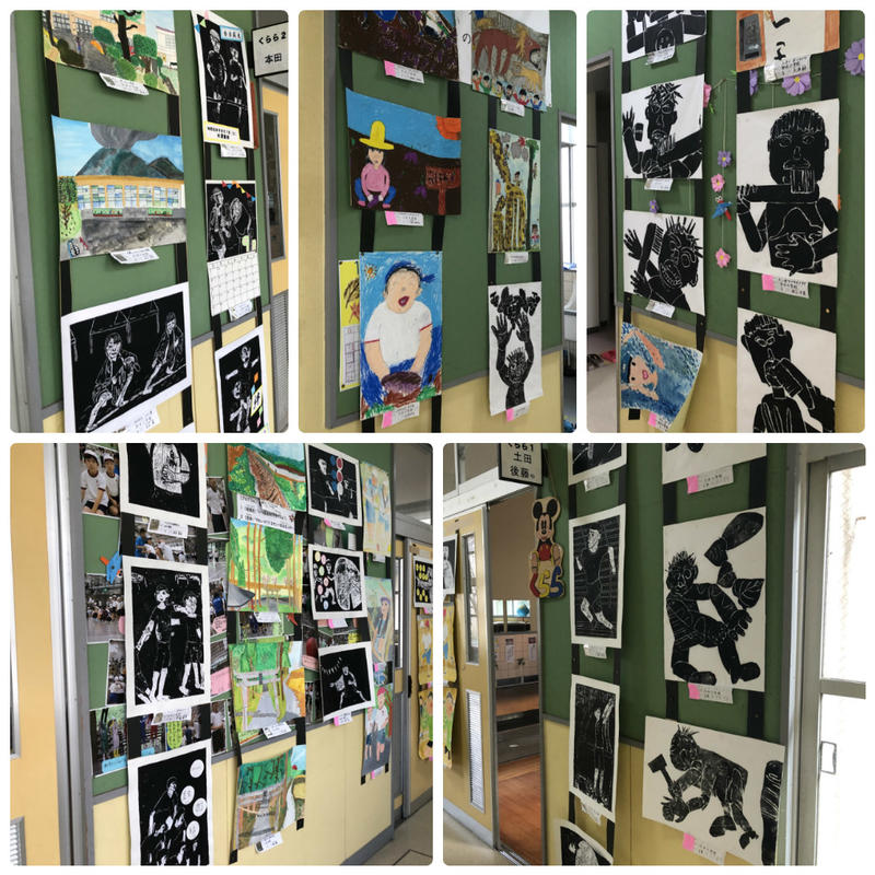 校舎1階の廊下が、子どもたちの絵や版画の作品でいっぱいです。