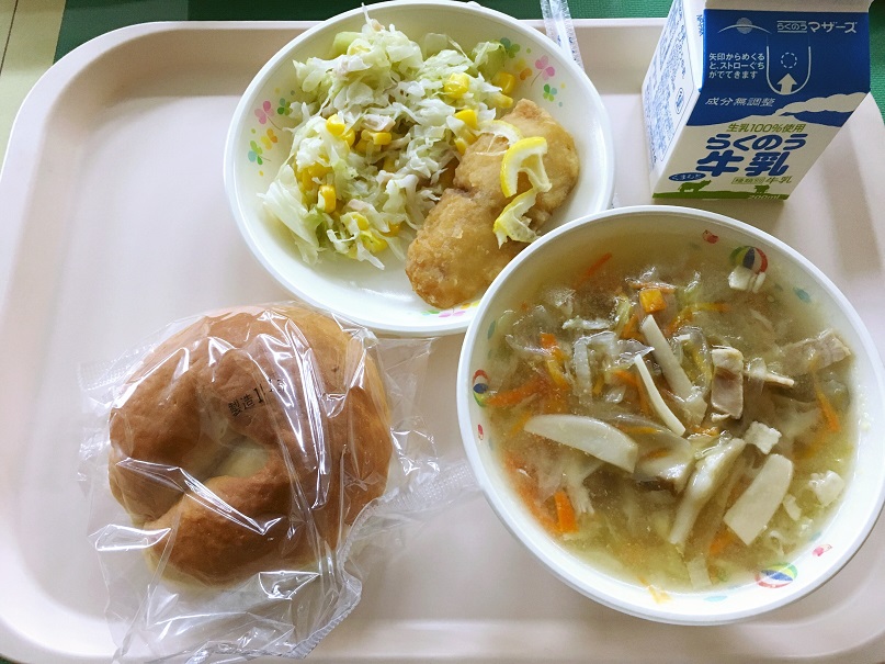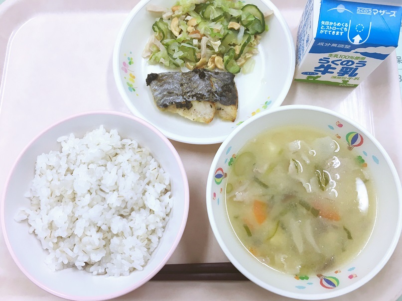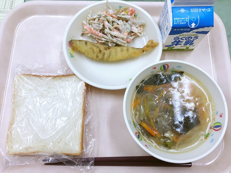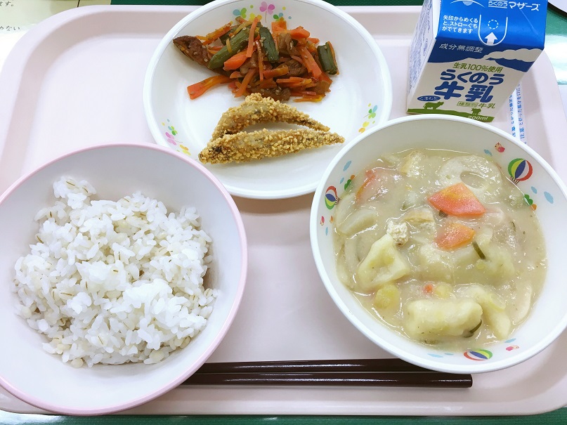 今日、1年生教室に行った時、黒板に『秋のものをみつけよう』と書いてありました。コオロギ、イチョウなど、秋ならではの名前が挙げられていました。さつま汁に、秋が旬のさつまいもとしめじが入っていたので、「今日の給食にも秋のものが入っているよ。わかるかな?」と、聞いてみると、「さつまいも!」「しめじ!」と、すぐに答えてくれました。子どもたちの食に関する興味の高さに驚いた給食時間でした♪