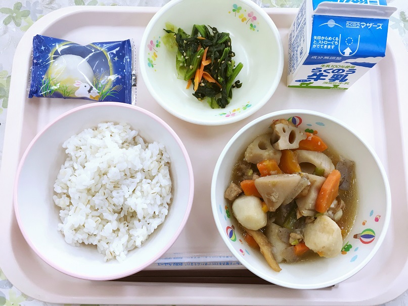 今日は、十五夜です。農作物の豊作を願った行事です。十五夜メニューとして、月見団子を付けました。「あんこが入っていますか?」と、団子の中身に、子どもたちは興味津々でした。みたらしあんが入った団子を食べて「おいしいです!」と、言っていました。