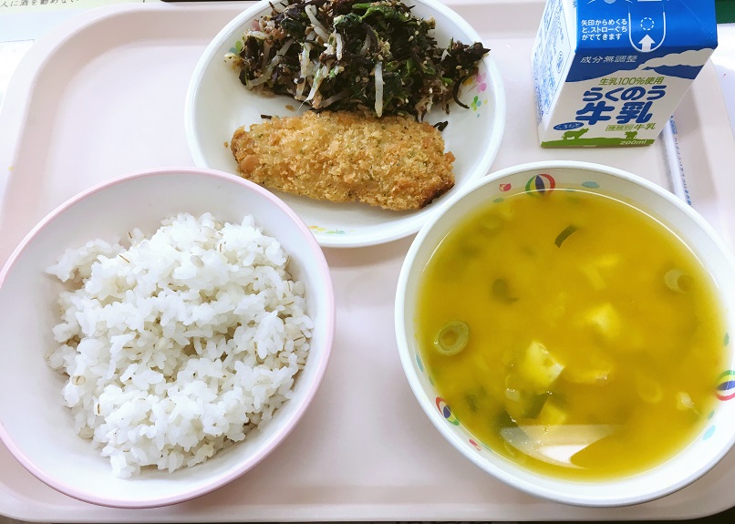 今日の給食では、夜盲症を防ぐビタミンAを多く含む食材(チーズ、ほうれん草、かぼちゃ)を取り入れました。感想では、かぼちゃのみそ汁がおいしかったという意見が多かったです。かぼちゃの甘みが溶け込んでいました。
