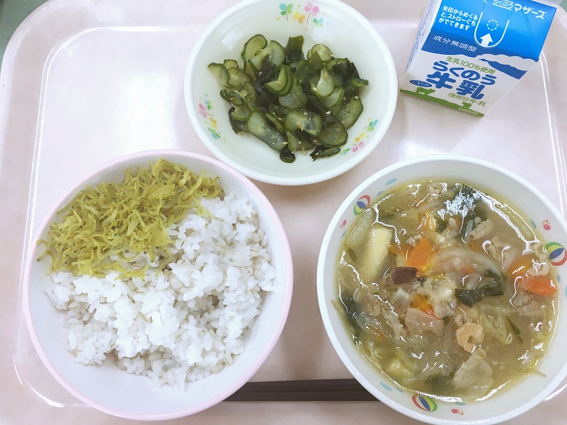 そぼろ煮ときゅうりの和え物がおいしかったです。おみその味が好きでした。残さず食べました。(1年生)