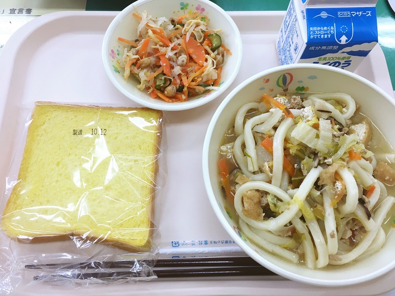 肉きつねうどんが1番美味しかったです。僕はおかわりをしました。和え物もがんばって食べました。(1年生)