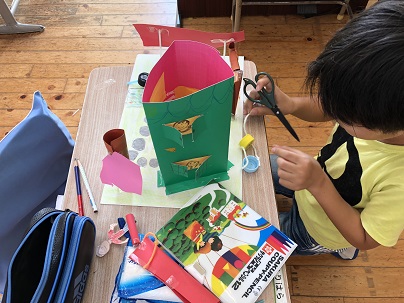材料、はさみ、色鉛筆、頭…、フルに使うことを楽しんでいる