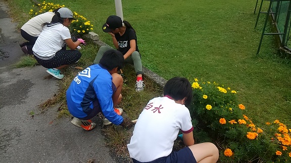 最近、環境ボランティア委員会が、昼休みに花壇などの草取り