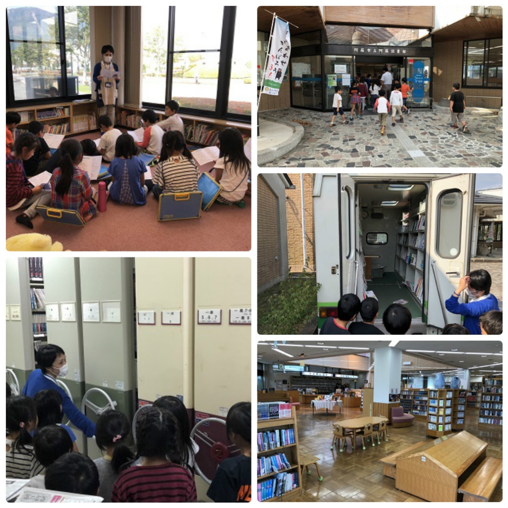 今日は、2年生がバスに乗って阿蘇市立図書館に見学に行きました。