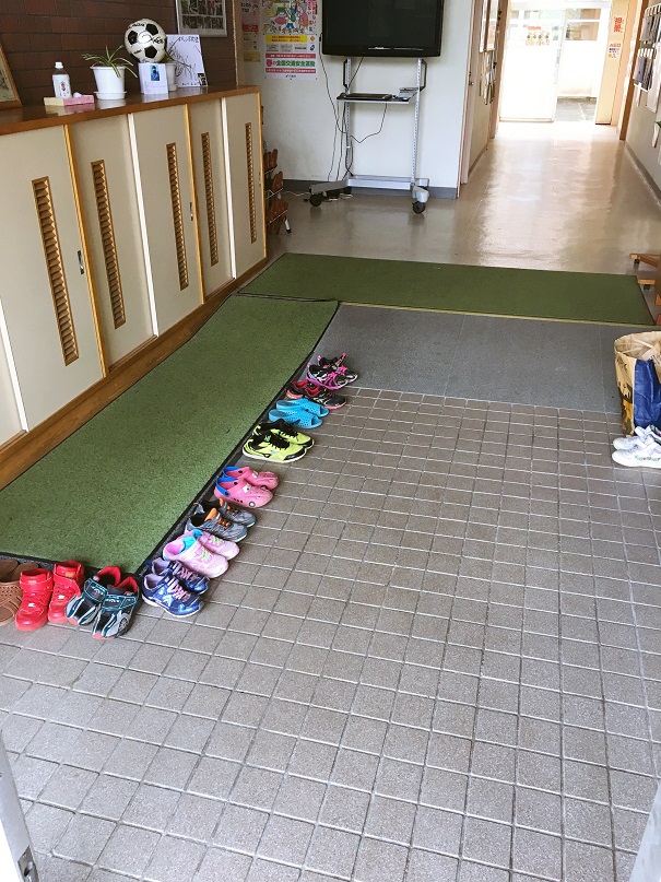 外出しようと、職員玄関に行くと、子どもたちの靴がきれいに並べてありました。