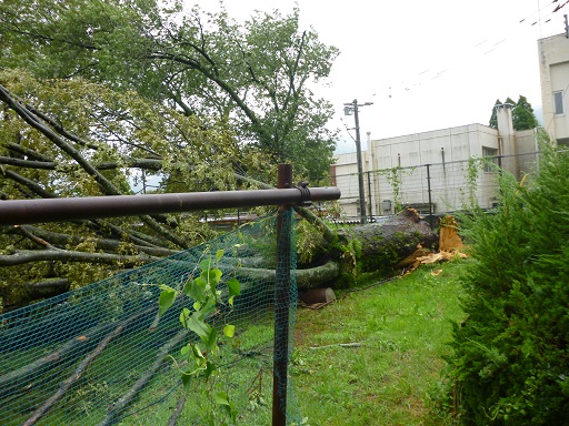 旧白水中学校では、大きな木が写真のように風で倒されてしまいました。