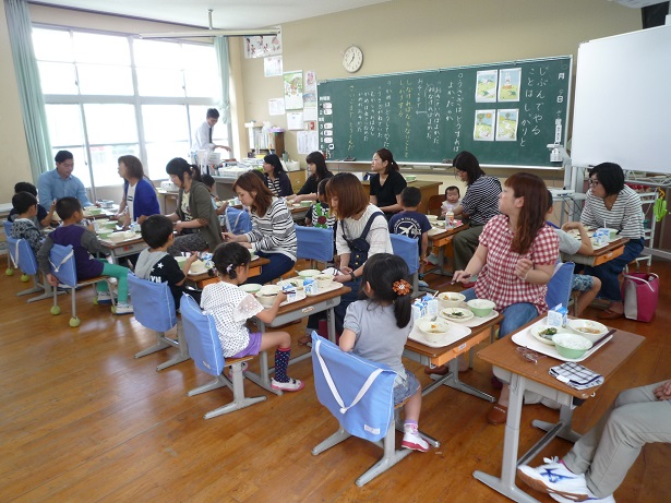 1年生は、おうちの方と一緒に給食を食べられるということで、朝から