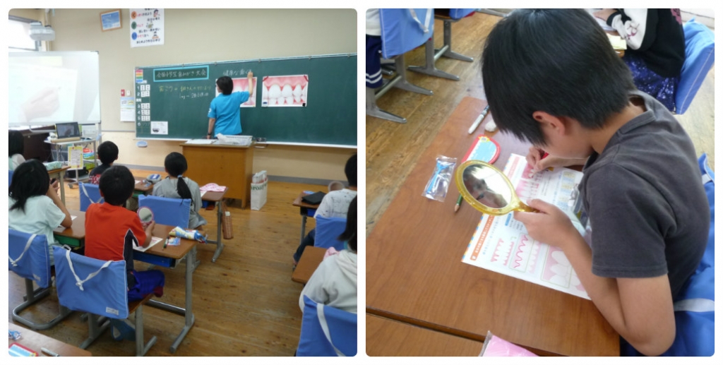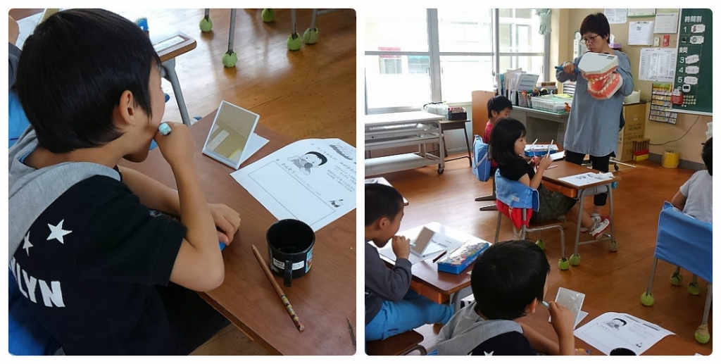子どもたちは手鏡で自分の歯茎や歯の様子を観察したり、歯みがき