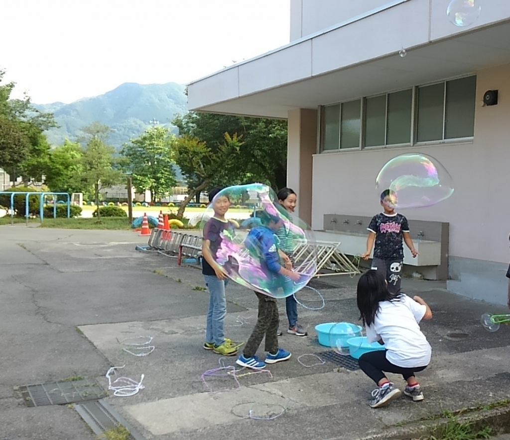 科学クラブでは、「大きなシャボン玉を作ろう」という活動をしました。