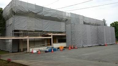 学校の体育館の周りに足場が組まれました。