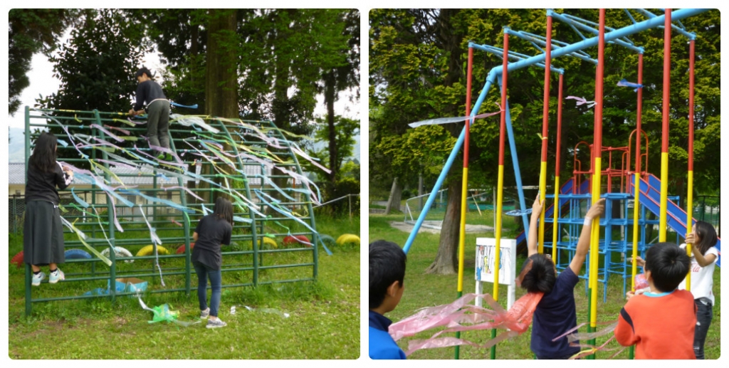 連休前、6年生が運動場の遊具に何やらセロファンやスズラン