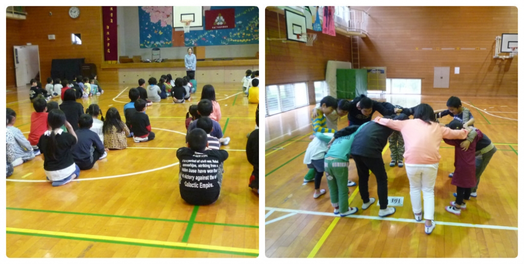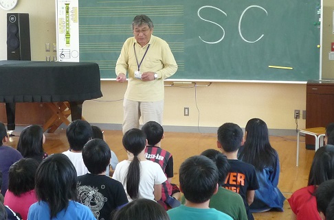 来校され、昼の集会の時間に全校の子どもたちに話をしていただ