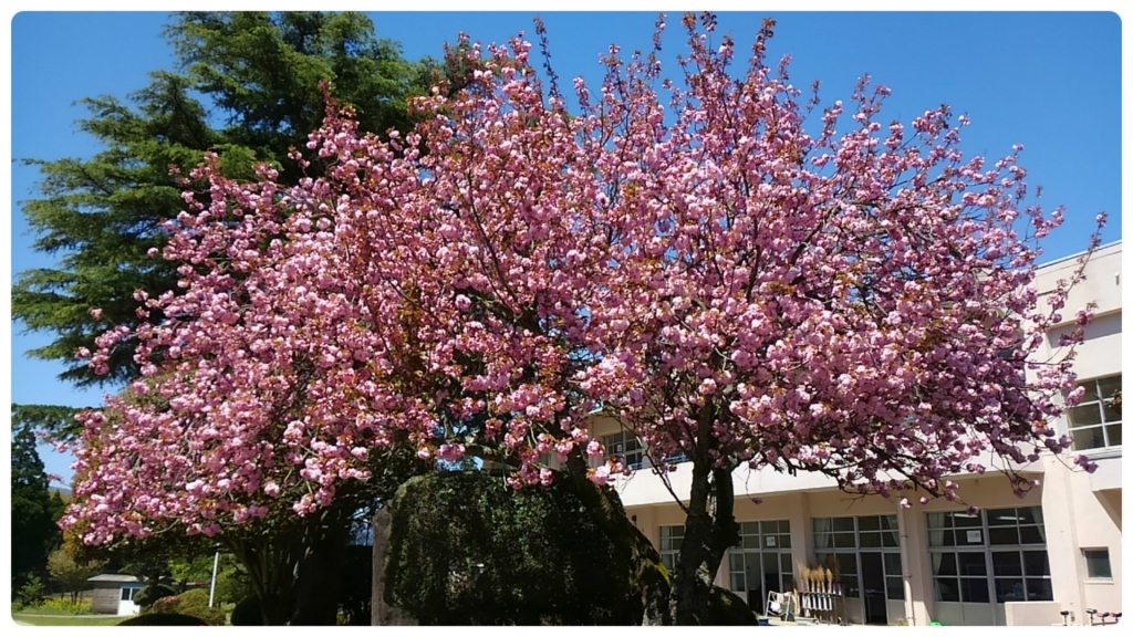 今年は桜の開花が遅く、学校のヤエザクラは数日前に満開となりました。
