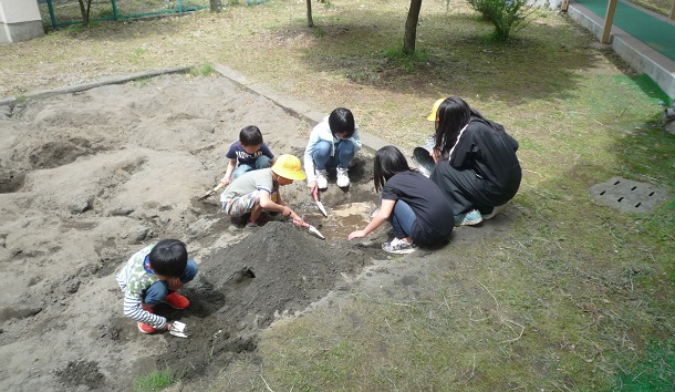 最近は砂場で1年生と6年生がなかよく遊んでいます。
