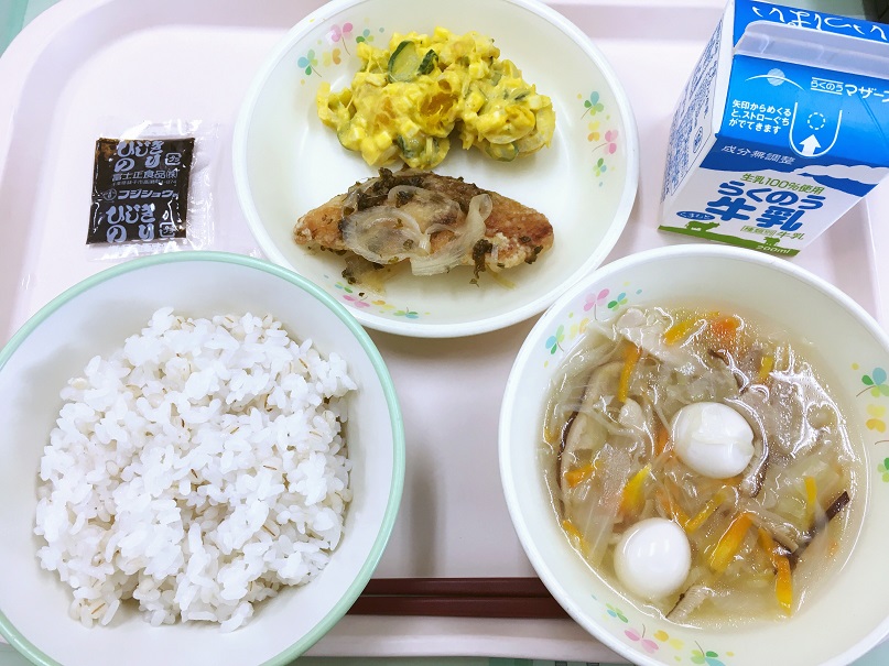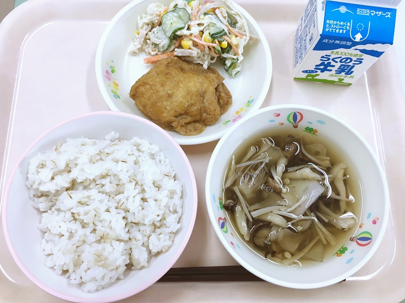 今日は、えのきたけ、エリンギ、しめじ、まいたけ、きくらげの5種類のきのこ類を使って、汁物を作りました。きのこ類は食物繊維を豊富に含んでいます。きのこの風味が口に広がり、だしもよくきいていました。子どもたちの「おいしいです!」という声を聞くことができ、嬉しく思いました。4・5年生は、余ったきのこ汁を上手につぎ分けていました!残さず食べてくれてありがとう(^O^)♪