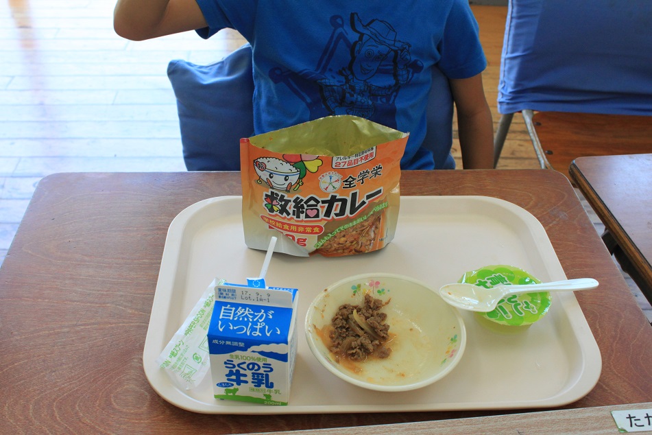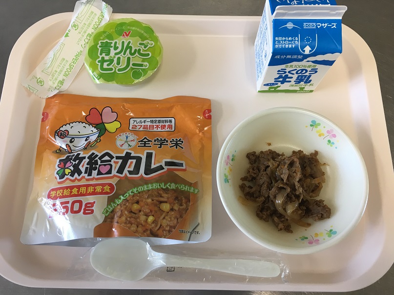 今日から2学期の給食が始まりました。少し早いですが、9月1日の「防災の日」に合わせて、給食用非常食の「救給カレー」を出しました。