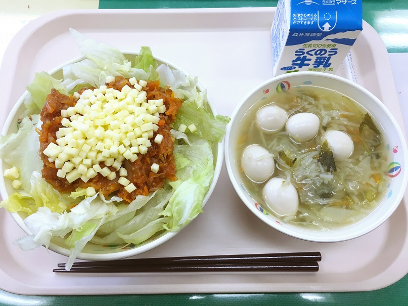 今日は、タコライスがおいしかったです。たくさん具材が入っていて、口の中でたくさんの味がしました。すごくおいしかったです。(6年生)