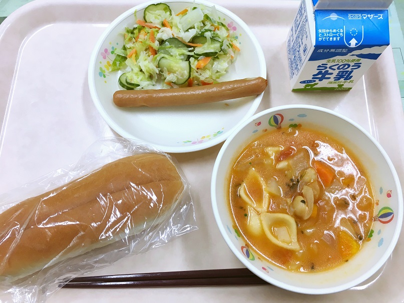 今日は、自分で作るセルフドッグでした。各教室をまわって、子どもたちの食べている様子を見てみると、ウインナーをパンに挟んで食べる子もいれば、コールスローをパンに挟んで、ウインナーだけを食べていたり・・・と、どんな食べ方をしようかな?と、悩みながら、自己流で食べている子が多数でした。(私は、ウインナーとコールスローをパンに挟んで食べました♪)