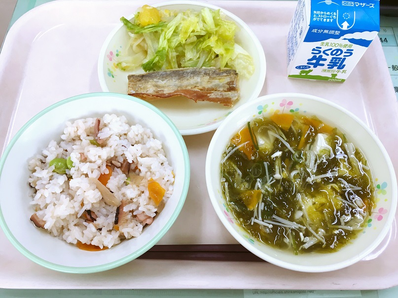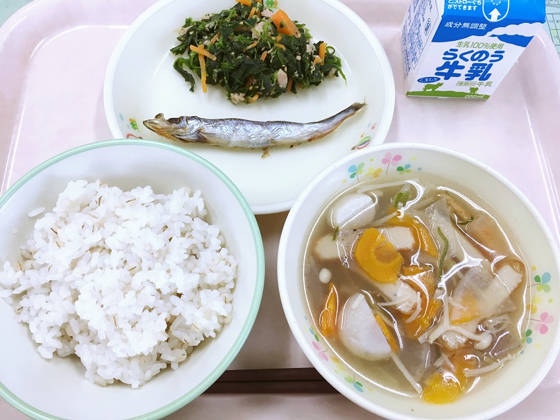 今日は、たこ飯・太刀魚の唐揚げ・あおさ汁と、海の幸をたくさん使った給食でした。久々のたこ飯で、子どもたちも喜んで食べていました。