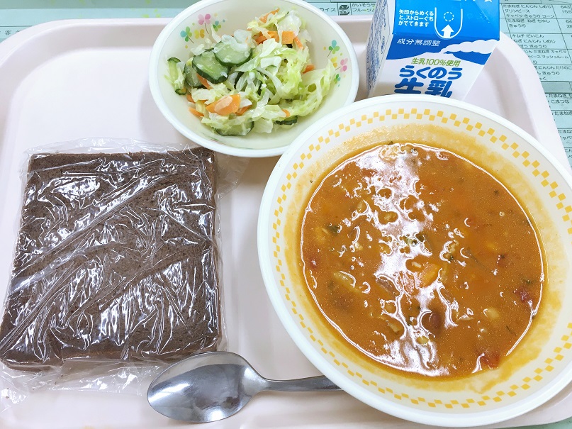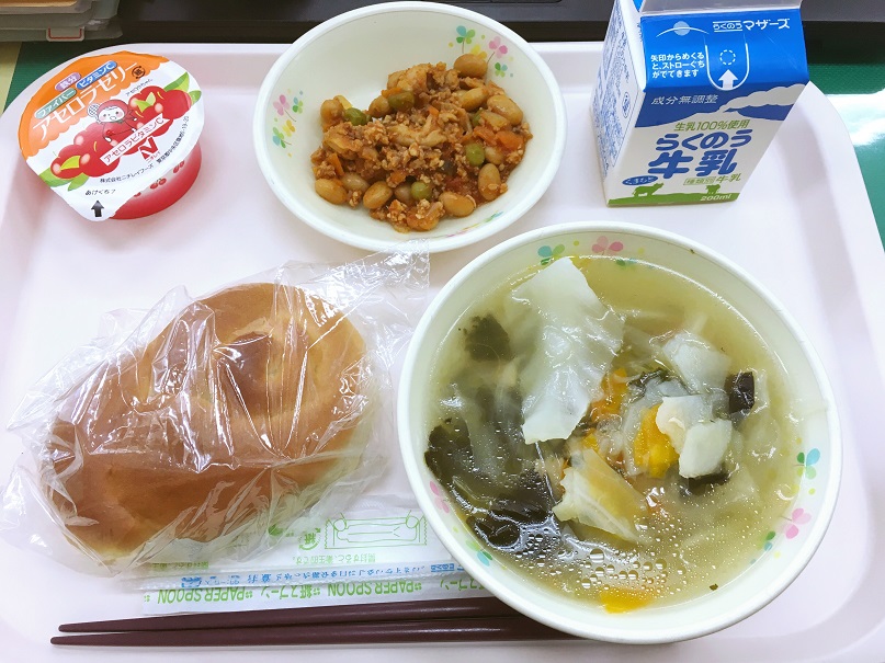 チリコンカンがおいしかったです。パンに挟んで食べるととってもおいしかったです。ゼリーもおいしくて、もう1つ食べたかったです。(1年生)