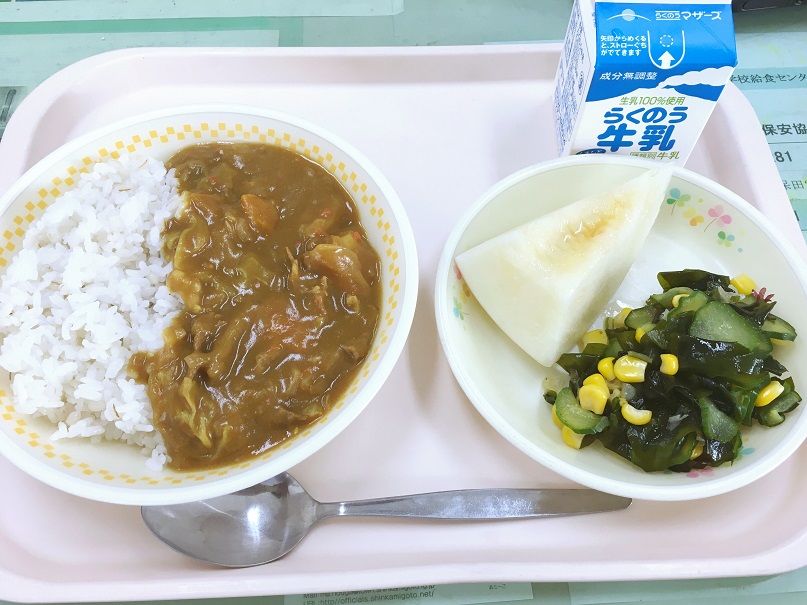 今日のカレーは、キャベツを入れています。キャベツを入れることにより、甘みが増し低学年はより食べやすくなったと思います。