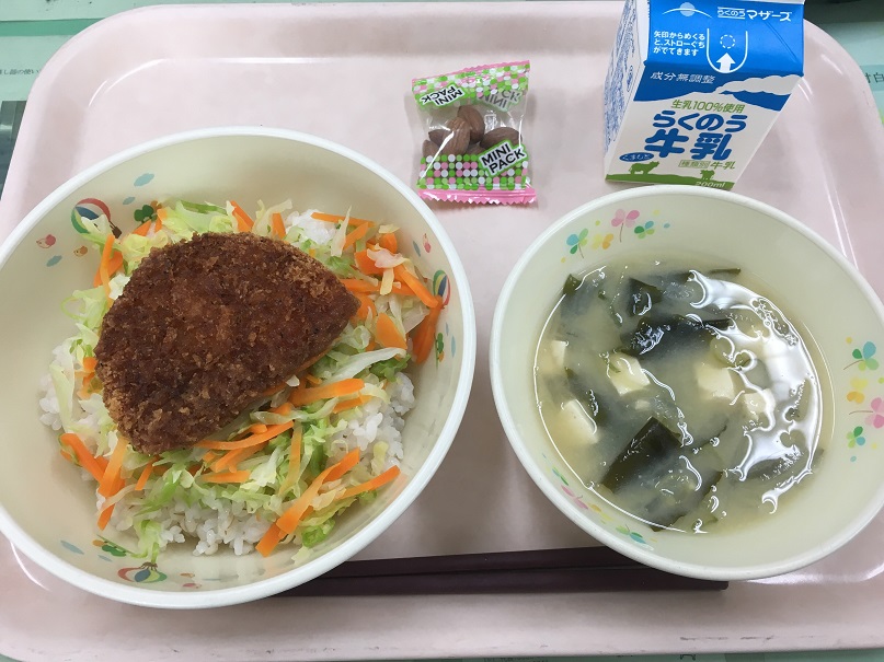 今日は、疲労回復効果のあるビタミンB1を多く含む豚肉で、ソースカツを作りました。揚げたカツに、中濃ソースやケチャップ、砂糖等の調味料を混ぜたソースをかけています。見た目ではあまり分からないため、4・5年生教室に行くと、「先生!ソースはないんですか!?」と、心配していました(^^;) 「おいしかったです。」と、子どもたちと先生たちから大好評でした♪